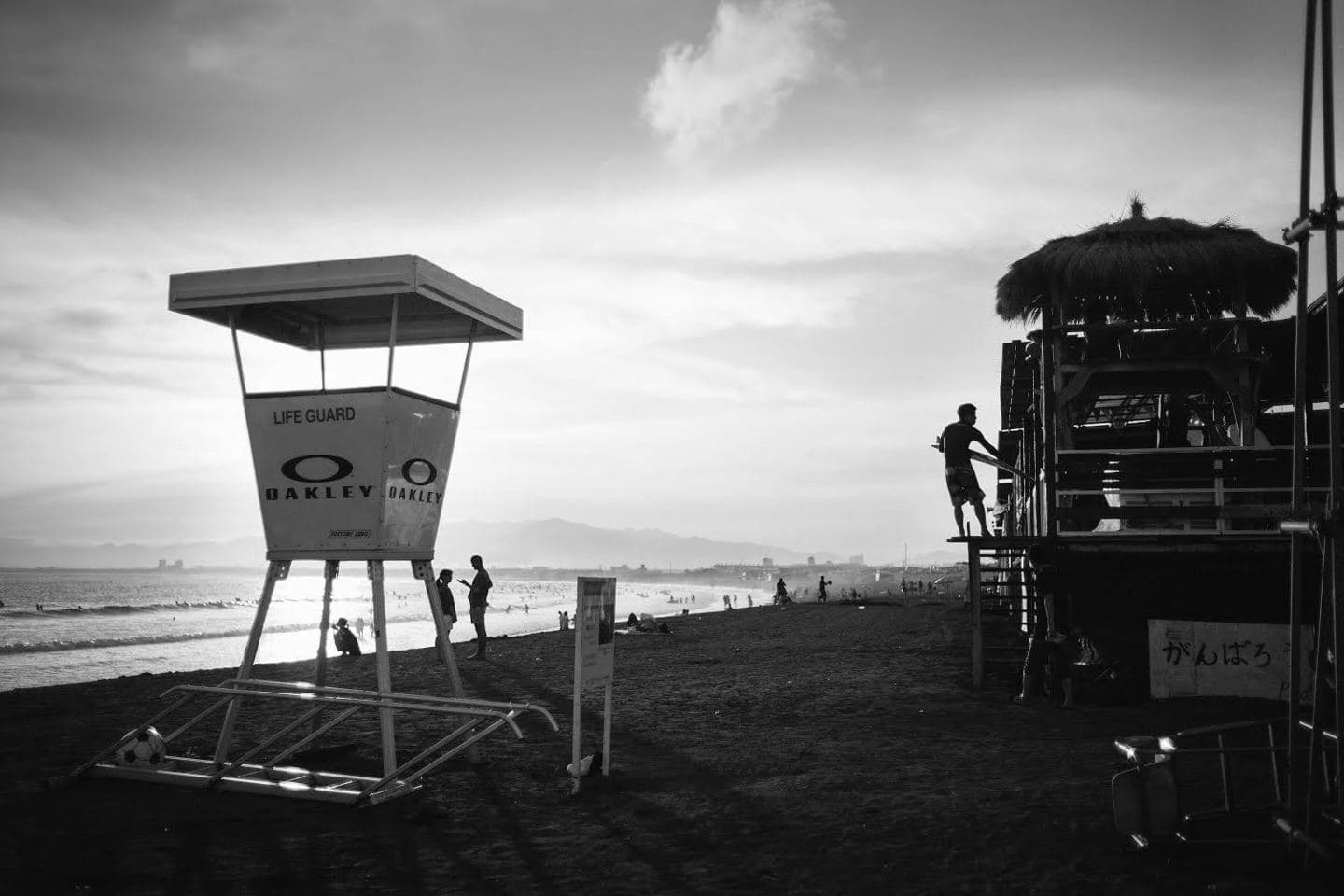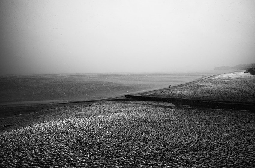 普段は暖かい湘南に雪が降った。ライカを持って七里ヶ浜に行くと吹雪いていて寒さで海面から海霧が立ち上り、砂浜に雪が積もり始めていた。人っ子一人居ないその浜辺を何故かお年寄りが背中を丸めて歩いていた。真鍮のため凍てつくライカを構え震える手でシャッターを切った。